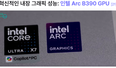 이번 그램에서 가장 놀라운 변화는 단연 인텔 Arc B390 GPU입니다. XE3 아키텍처 기반으로 12개의 XE 코어를 탑재하여, 기존 인텔 내장 그래픽과는 체급 자체가 다릅니다.